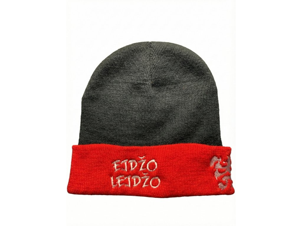 Zimní pletená čepice unisex v černé barvě s červeným lemem.